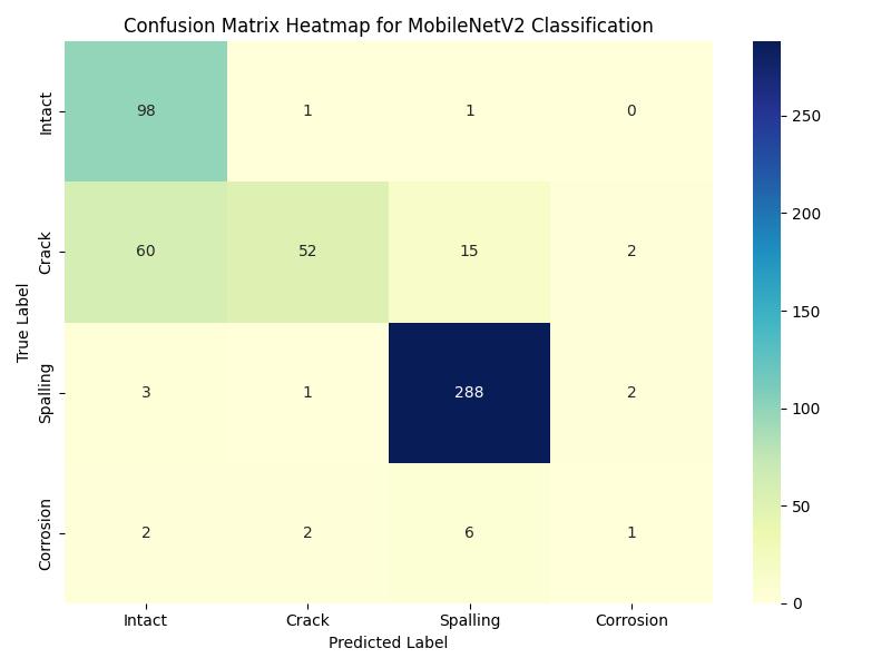 TheMobileNetV2showedstrongperformanceforthe "intact" and "spalling" classes. Minor and corrosion classes were less accurately predicted due to class imbalance and visual similarity between categories. The confusion between "minor" and "moderate" damage may be mitigated in future studies by incorporating temporal data or additional image enhancements.