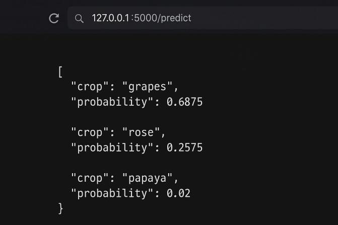 The ML layer loads the trained Random Forest model and the label encoder. Feature ordering is maintained using a JSONbased schema to avoid inference discrepancies. Model inference generates probability distributions over 22 possiblecrops Thetopthreecropsareextractedandreturnedtothe UI,alongwiththeirprobabilityscores.