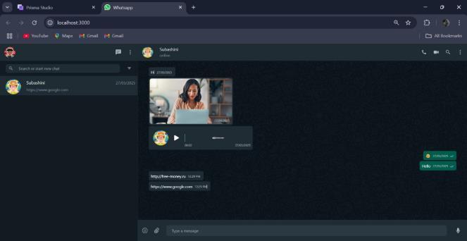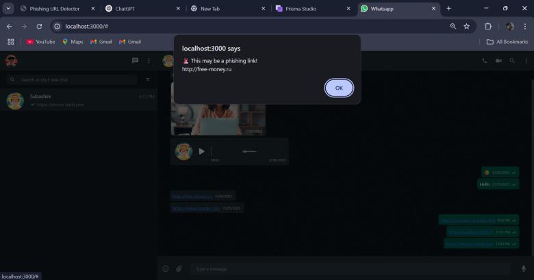 Unlike conventional phishing detection techniques, which operate in a reactive manner, this implementation provides a proactive approach to phishing prevention, significantly reducing user exposure to cyber threats. As phishing techniques continue to evolve, future improvements Future enhancements include integrating deepfakedetectionforvideoandvoicecalls,implementing behavioral analysis, deploying AI-powered CAPTCHA, and extending the system to mobile applications beyond the WhatsApp Web clone to further strengthen security. By integrating these advanced security mechanisms, this project lays a strong foundation for secure and intelligent real-timecommunication,contributingtothefutureof AIdriven cybersecurity solutions in digital messaging platforms