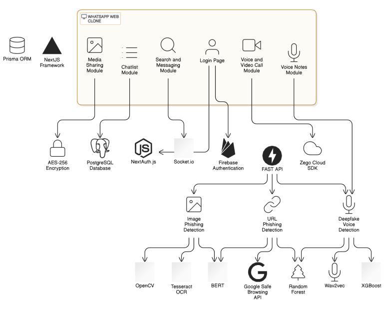 The proposed system introduces an AI-powered phishing detection system integrated into a WhatsApp Web Clone, offering real-time and multi-modal phishing detection capabilities. This system utilizes Natural Language Processing (NLP) for message analysis, Computer Vision (CV)andConvolutionalNeuralNetworks(CNNs)forimage phishing detection, and audio processing models like Wav2Vec for deepfake voice detection. The integration of Optical Character Recognition (OCR) enhances the ability toextractandanalyzetextembeddedinimages.Real-time alert mechanisms notify users immediately when suspiciouscontent(text,URL,image,orvoice)isdetected, helping prevent interaction with phishing attempts. Additionally,AES-256encryptionisusedtoensuresecure message transmission, protecting user data from interception or tampering. The system is designed to be scalable and can be extended to other messaging platformsbeyondWhatsApp,makingitfuture-ready.