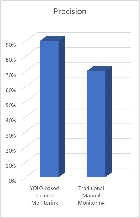 The YOLO-based Helmet Monitoring system performs significantlybetterthanTraditional Manual Monitoring in terms of Precision, Recall, and F1 Score, providing more reliable, accurate, and comprehensive helmet detection. TraditionalManualMonitoringissubjecttohumanerrorand fatigue, leading to lower Precision, Recall, and F1 Score, which can affect the overall effectiveness of safety monitoringonconstructionsites.
