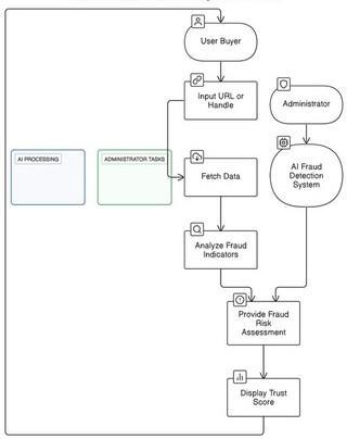 AI-driven fraud detection platform designed to significantly enhance consumer safety on popular e-commerce platforms suchasInstagramandFacebook.Thecoreofthesystem relies onmachinelearning(ML),naturallanguageprocessing(NLP), and real-time data analysis to identify and combat fraudulent activities.It works by analyzing various trustworthiness indicators, including domain age, trust badges, social media presence, review consistency, and linguistic patterns found in product descriptions and customer reviews. These indicators are essential for assessing the authenticity of e-commerce accounts and websites, as they help to determine whether a platform or seller is legitimate or potentially fraudulent. By integratingAPIsfromInstagramandFacebook,thesystemcan collect data from user interactions, advertisements, and account details, processing it through advanced ML and NLP models. This data-driven approach enables the system to generate real-time fraud risk assessments, giving consumers theability to makeinformeddecisionsandavoidscamswhile shoppingonline.