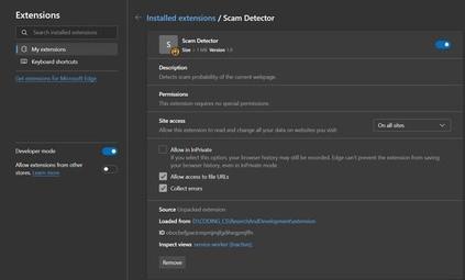 indicators. Additionally, it has been granted permission to access file URLs, meaning it can analyze locally stored web pages, and collect errors, likely for debugging and improving detection capabilities. However, it is not currently enabled for InPrivate mode, meaning it does not functionwhilebrowsingprivately.