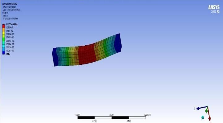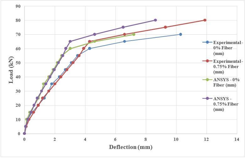 FiniteelementanalysiswasperformedinANSYSWorkbench to model the same reinforced beams that were tested experimentally.TheconcretewasmodeledusingSOLID65 elementsandreinforcementusingLINK180elements.The simulation used the same material properties, loading conditions,andsupportconstraintsasinthephysicaltests. Theload-deflectionresultsobtainedfromtheANSYSmodel were in good agreement with experimental data. For the GPC-SF(0%) beam, the maximumloadobservedin ANSYS