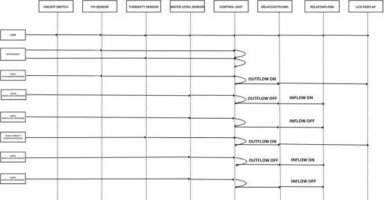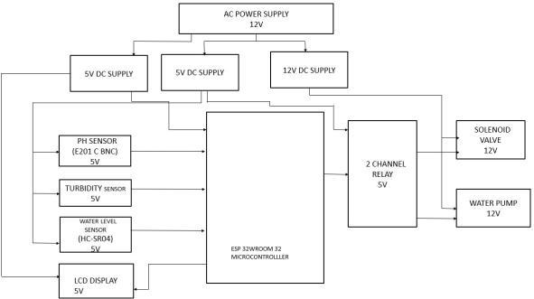 The Smart Aquarium System works by monitoring water quality in real time and maintaining optimal levels by regulatingwaterflowautomatically.Thesystemisdrivenby a 12V DC power supply and supplies 5V and 3.3V to the different components such as the ESP32-WROOM-32 microcontrollerandthesensors,whereasthesolenoidvalve andthewaterpumpoperateon12V.pHsensor(E201-CBNC, 3.3V)measureswateracidity,turbiditysensor(5V)measures suspendedparticles,andwaterlevelsensor(HC-SR04,5V) maintainstheproperwaterlevel. Sensorsprovidereal-time measurementsto the microcontroller, which analyzes the values and com- pares them to thresholds set prior to installation.Incaseofacceptablewaterquality,thesystemis dormant;otherwise,itinitiatescorrectivemeasures.When pHorturbidityisbeyondsafe limits, the inflow relay (5V) turns on the 12V solenoidvalvetopermitnewwaterinto the tank. In the case of excessive water level, the outflow relay(5V)turns on the12Vwaterpumptodrainsurplusor contaminated water. The LCD display (5V) gives live indications of system condition and water status. This
