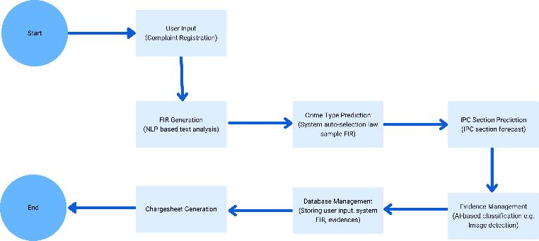 By integrating these capabilities, the proposed system enables automatic FIR drafting, offense categorization, IPC-mapping, and sentencing prediction. Such automation aligns with global trends where legal AI systems are increasingly used for document screening, case-law retrieval, fraud detection, and judicial decision support [12], [15]. The system thus enhances efficiency, transparency, and fairness within law-enforcement procedures.