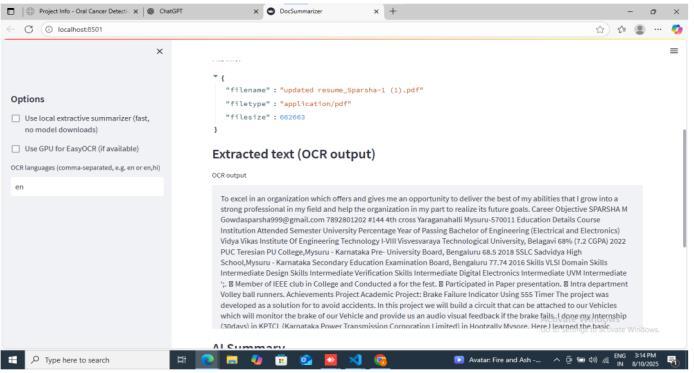 In most organizations and institutions, documents are produced,stored,andsharedinawidevarietyofformats, includingprintedpapers,scannedPDFs,handwrittennotes, andimagebasedrecords.Ontheotherhand,theexponential growth of digital content has created a pressing need for summarization.Usersarefrequentlyoverwhelmedbylarge volumes of information and require quick, concise, and contextually accurate summaries rather than raw text dumps.Existingextractivesummarizationtechniquesoften failtocapturetheessenceofdocuments,whiletraditional rule-basedmethodslackadaptabilityacrossdiversedomains andlanguages.