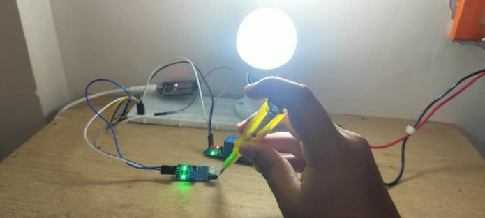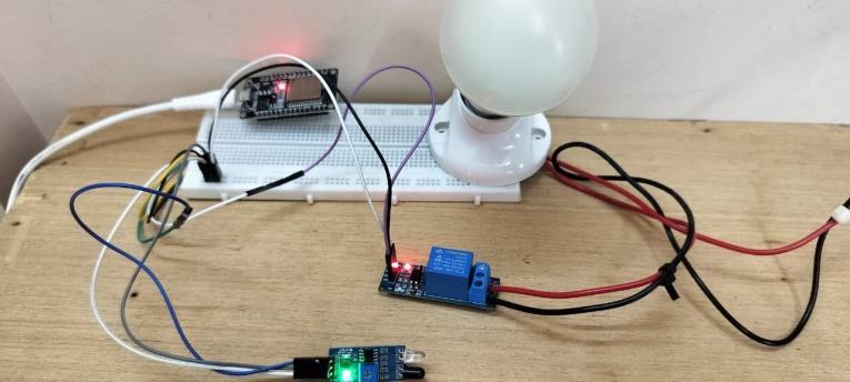 Alright, here's the story: you have an ESP32 microcontroller, a 5V relay, an AC light bulb, and an IR detector, and these elements are all working together in a techiecombination!Basically,theIRsensorisonlookout when it detects movement, it contacts the ESP32. The ESP32 responds "ok", and activates the relay. The relay is the gatekeeper between the low voltage control elements and the infamous AC side, so that nothing gets toasted. When it is activated, it passes the power through and the bulblights.Afteratimeofinactivity,theESP32willdecide itisunnecessarytokeeptherelayactive,andtellstherelay todisconnect,andthelightgoesout.Therefore,youdonot have to keep flipping the switch by hand. Less work and moreelectricitysavings;forlazyhumans,andourplanet,it isawin!
