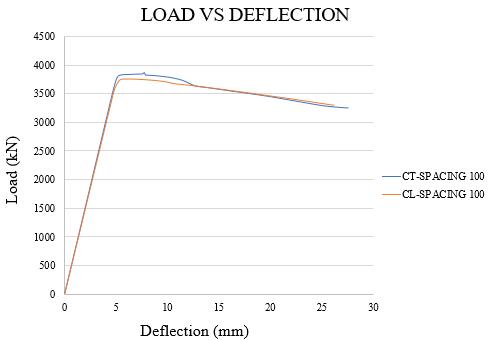 AcomparativestudyofTandL-shapedcorrugatedSSCPW under axial loading was done In this study, models of 2.5 mmplatethickness,51mmcoretubediameterand100mm verticalspacingofcoretubeswereconsidered.Thicknessof thecoretubesweretakenas0.5mmforallthemodels.Chart -1showstheloadvsdeflectiongraphoftheTandL-shaped corrugated SSCPW. Table 3 shows the ultimate load and deformationvaluesoftheSSCPW.CT-SPACING100andCLSPACING 100 represents corrugated T-shaped and corrugatedL-shapedcorewallswith100mmverticalspacing ofcoretubesrespectively.