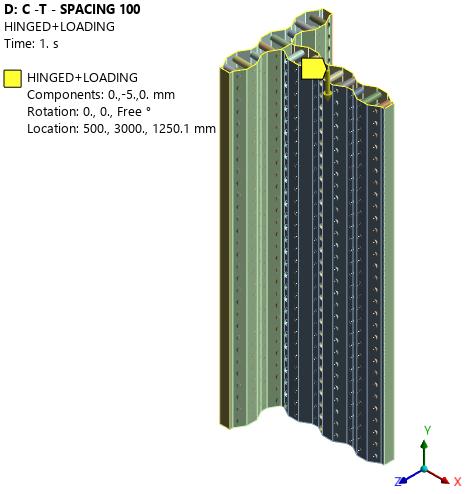 The boundary conditions are set to simulate realistic constraints: the bottom of the SSCPW model is fully fixed, restrainingalldegreesoffreedom,whilethetopishinged, allowing rotation but restricting horizontal movements in the X and Y directions. A displacement-controlled compressiveloadisappliedalongthecentroidalaxisofthe modeltoreplicateaxialcompression.Fig -5illustratesthe meshingpatternandtheapplicationpointofaxialloadon theT-shapedcorrugatedSSCPW.