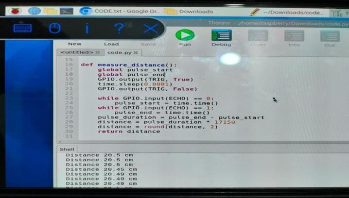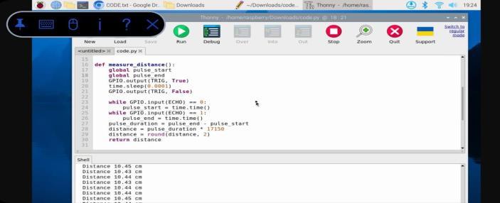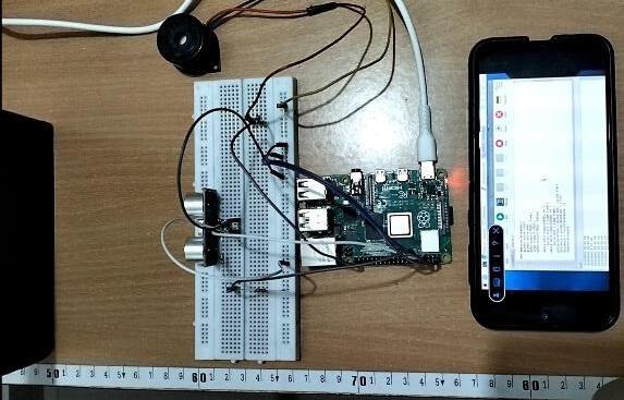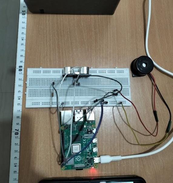 APythonscriptiswrittentointerfacewiththeGPIOpinsof the Raspberry Pi and control the proximity sensor. Visualization tools are used to display real-time distance measurementsgraphically,eitherlocallyontheRaspberry Pi's display or remotely via a web interface. The buzzer connectedtoRaspberryPi4givesaloudsoundalertwhen the distance measured by the proximity sensor reaches belowthethresholddistancefixed.Thebuzzerisconnected totheGPIOpinoftheRaspberryPifromwhichitreceives thesignalforthebuzzeroperation.