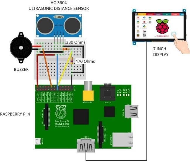 Figure2showsall theconnectionsoftheproposedmodel whichconsistsofRaspberryPi4connectedtoanultrasonic sensorandbuzzerthroughGPIOpinsandtoa7-inchdisplay throughHDMIportandcables.IntegratingRaspberryPiwith the proximity sensor helps develop a versatile distance measurement system. The Raspberry Pi serves as the foundationalembeddeddevicewithinthesystem.Despiteits