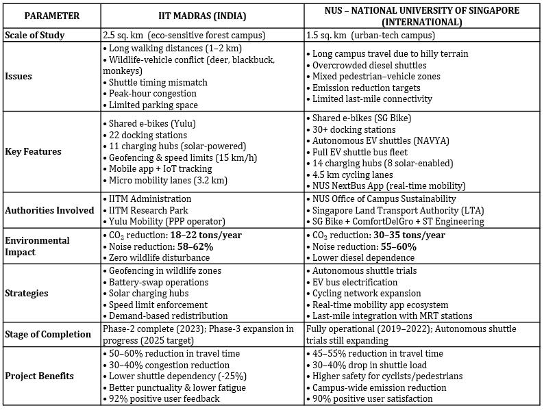 In conclusion, the case studies of National University of SingaporeandIITMadrasexpandsandsolidifiesthebroader globallessonsthatarecomingfromplaceslikeBengaluru, Paris, Brisbane, and San Francisco. The IITM and NUS examples indicate how comparable ideas may be operationalized inside big, semi-controlled institutional campuses, whereas global urban situations illustrate how micromobilitycanbegovernedatacityscale.Collectively, theseexperiencesdemonstratethate-micromobilityworks best when it is backed by transparent governance frameworks, context-specific laws, and specially designed low-speedinfrastructurethatprotectspedestriansandusers alike.