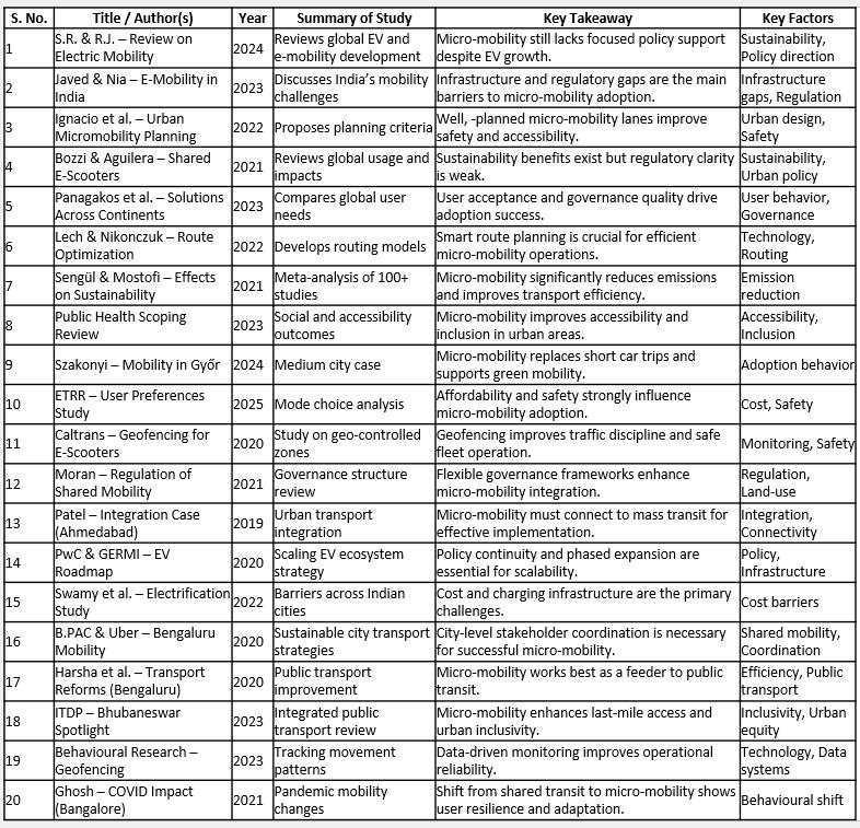 Stakeholder cooperation, data-driven operations, and flexible regulatory frameworks that can address safety concerns,publicspacechallenges,andchangingdemandare common success elements that appear in all situations. Campus-level policies like speed limits, wildlife-sensitive zones, and digital mobility platforms at IITM and NUS are paralleled by city-level efforts like geofencing in Paris or coordinated operator management in Brisbane. These similarities highlight the importance of factors like trip lengthappropriateness,pedestrianintensity,environmental sensitivity,andinfrastructurepreparednesswhenfiguring out where e-micromobility, particularly geo-fenced operations,maybedeployedinapracticalandresponsible manner.