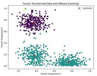 Fig -3:Fourier-transformeddataclusteredusingKMeans, withcentroidsclearlymarked (DSC)approachusingasyntheticallygenerateddatasetwith 1,000 samples and 3 cluster centers, created using the