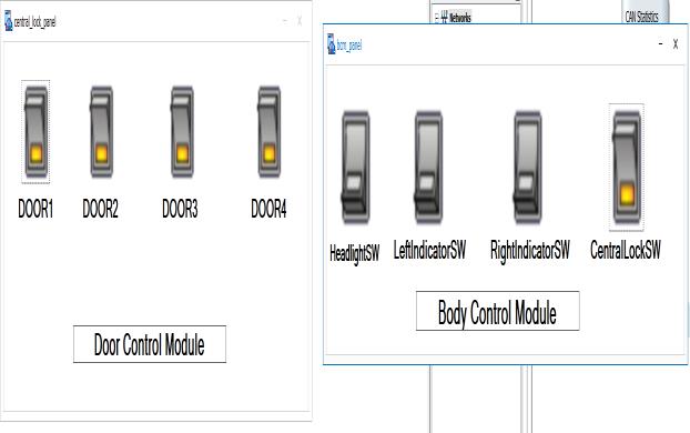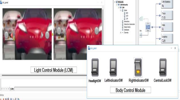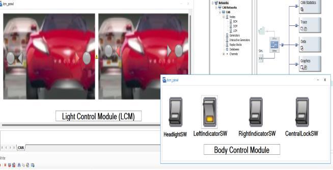 Toggle switches effectively controlled the left/right indicators and door locking simulation via Node 1. Fig 4 showsthatleftindicatorinONandrightindicatorisOFF. fig5showsthatrightindicatorisONandleftindicatoris OFF.Fig6showsthatDoorisunlockandlock.