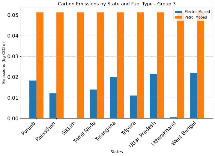 EV Mopeds: Emissions were lowest in states like Tamil Nadu and Karnataka (~0.01–0.03 kg CO₂e/km)[11].