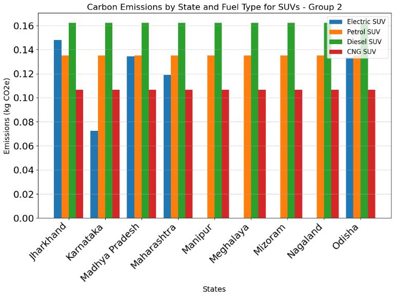 EV SUVs:Lowestemissionswererecordedinstates like Himachal Pradesh and Tamil Nadu (~0.08 kg CO₂e/km).Coal-dependentstatesshowedemissions ashighas0.16kgCO₂e/km,makingEVSUVsless advantageousinthoseregions[12].