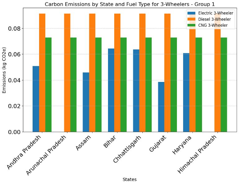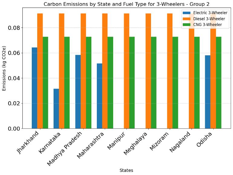Diesel and CNG Three Wheelers: Emissions remained constant across states (~0.08–0.09 kg CO₂e/km)[1].