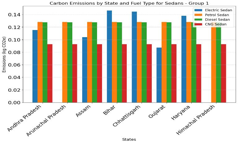 ICE Sedans: Petrol, Diesel, and CNG emissions remainconstantacrossstatesduetouniformfuelbased emission factors. Petrol and Diesel Sedans produce~0.12–0.15kgCO₂e/km,whileCNGSedans haveslightlyloweremissions(~0.11kgCO₂e/km) [1].