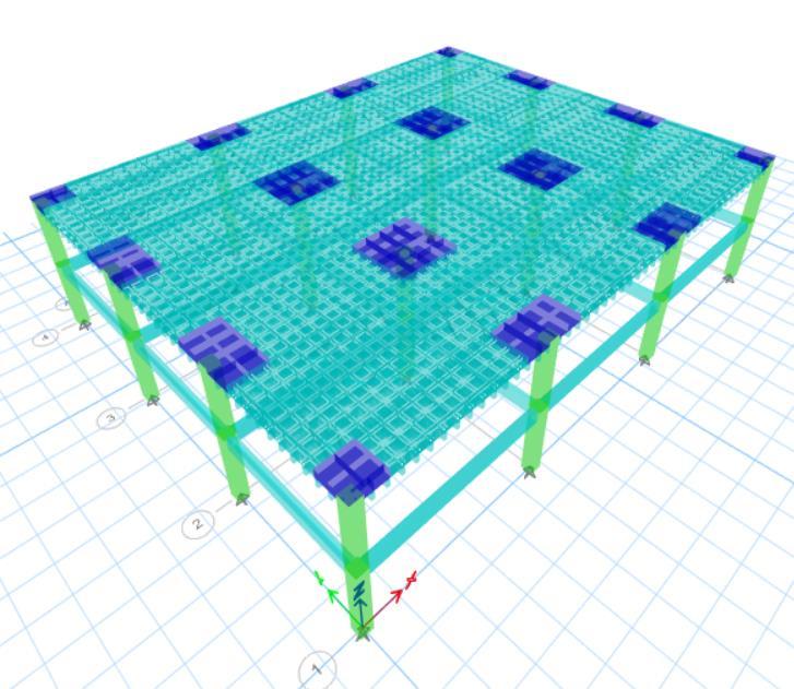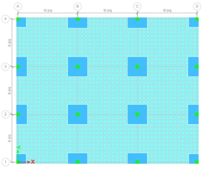 The analysis of the waffle slab was carried out using ETABS version 20.0.0. The structure was modeled consideringaCartesiangridsystemwithgridlinesspacedat 10metersintheX-directionand8metersintheY-direction. The slab was divided into multiple panels based on point coordinatesdefinedpreciselytomatchthebaylayouttypical for a waffle slab system. The resultant slab system can be seeninthefigurebelow.