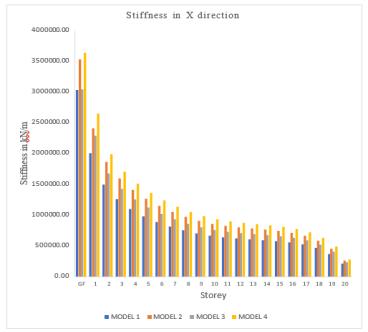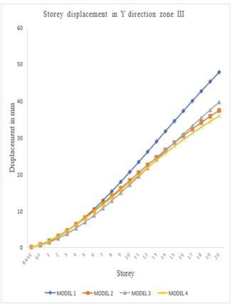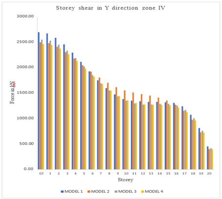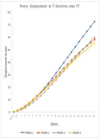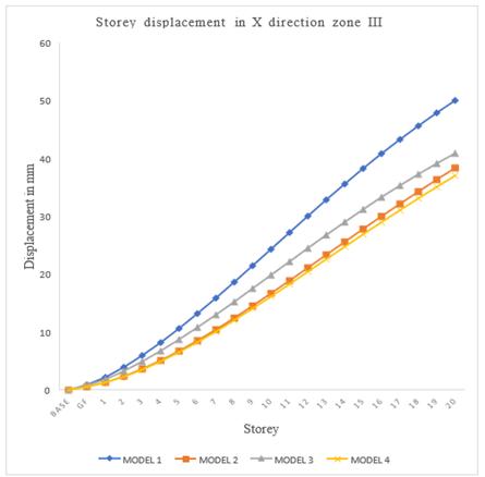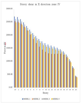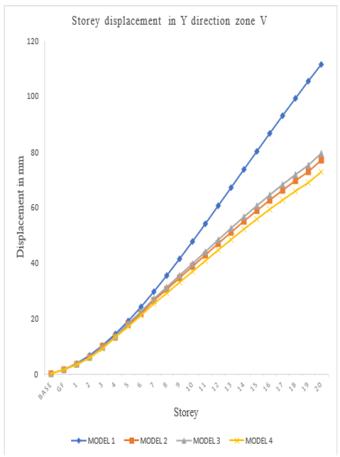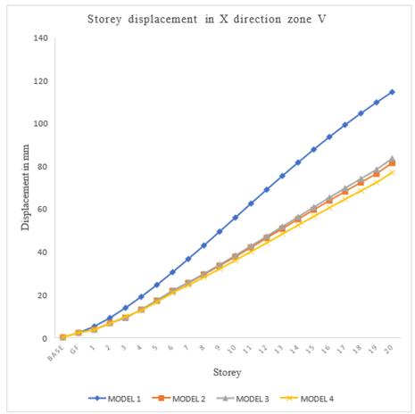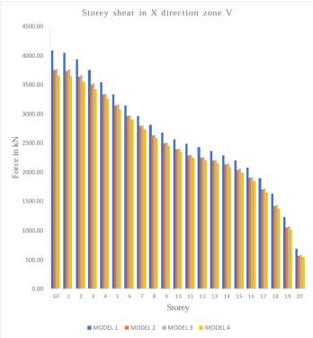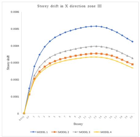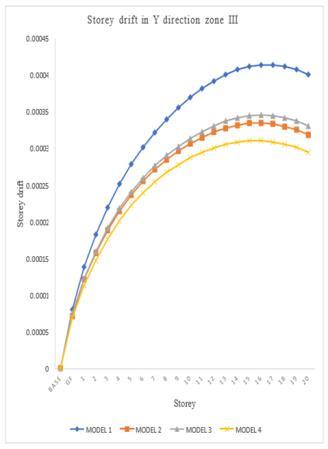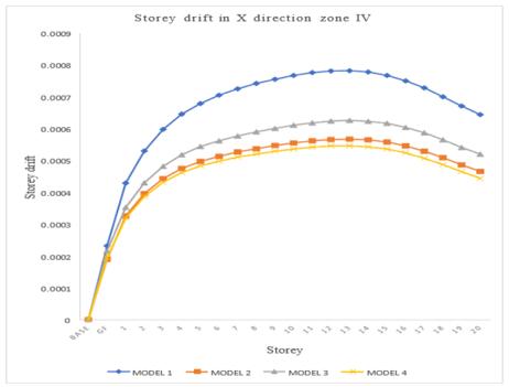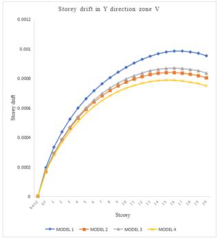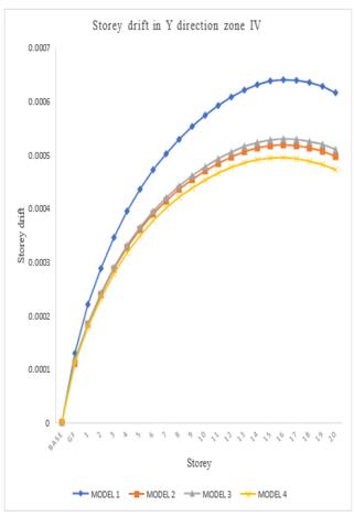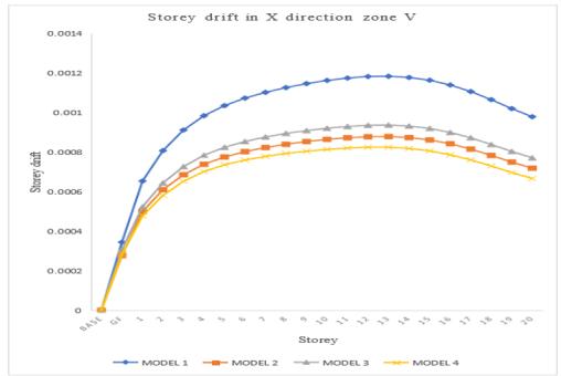 3)The storey drift in model 4 decreases drastically when comparedtomodel1.Whilethedifferenceinstoreydriftin model2andmodel4isminimalunderzoneIII,IVandV.
