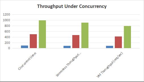 Throughput is the measurement of how a system will performonalargeflowofconcurrentrequests.Serverless functions in general (ex: AWS Lambda) started performances much faster and sustained about 920 requests/second, compared to VMs that stayed at about