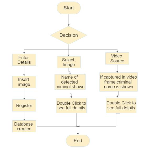 All paths finally converge to the End state, signifying successful completion of a lookup, registration, or video analysisoperation.Theflowchartrepresents a real-time, interactive system that assists law enforcement in registering, tracking, and identifying criminals using imageorvideo-basedinputs