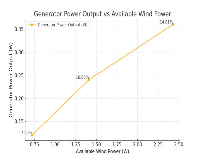 Comparethecalculatedwindpower1.41wattstotheactual electricalpowerbeinggeneratedandstoredin thebattery. Evaluatingthesystem'soverallefficiencybycomparingthe electrical power output to the available wind energy using formula,