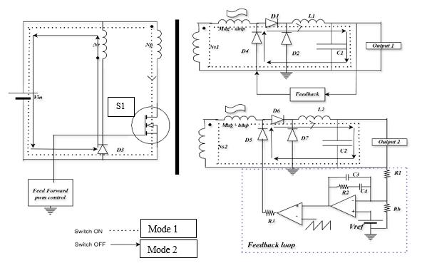 Inthismode,themainswitch(S1)isinONstate.Indicating thattheinputvoltageisappliedacross the primaryof the transformer. Current flows through the primary of the transformer as shown in Fig 1. With respect to the transformer dot convention, a corresponding voltage is inducedonthesecondarysidewhichallowsenergytransfer fromtheprimarytothesecondary.
