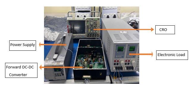 Fig 7 illustrates the hardware experimental setup of the forwardconverter.Thekeycomponentsofthiscircuitsetup includethefollowing: