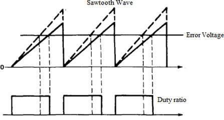 Theinputvoltagevariationmayautomaticallychangethe duty cycle hence degrading the performance of the converter.Thisrequiresaclosedlooptocorrecttheoutput dutycycle.Infeed-forwardtechnique,thePWMdutyratio changeswithchangeininputvoltageandhencemaintaining constantoutputvoltage.AnRCnetworkgeneratesarampor sawtoothwaveformwhichisdependentontheinputvoltage as shown in Fig 3(a) [4]. The generation of the ramp is dependent on the input voltage, for example if the input voltage doubles, the ramp waveform slope also increases proportionally and the duty cycle will tend to decrease as showninFig3(b)[4].