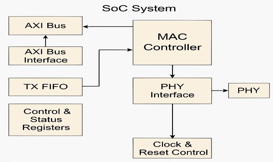 The PHY interface bridges digital MAC signals to the physical layer, which transmits signals over Ethernet media. Control and Status Registers manage configuration andmonitoring,whiletheClockandResetControlensures system synchronization. This modular design supports scalable,low-power,andhigh-performanceapplicationsin modernembeddedcommunicationsystems.