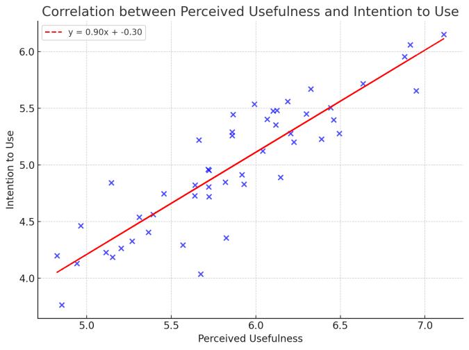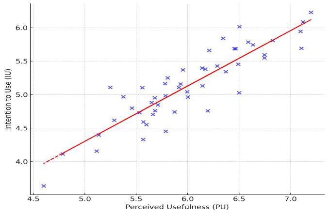 The figure illustrates the correlation between Perceived Usefulness(PU)andIntentiontoUse(IU).Itdepictsastrong positive linear trend, supporting the conclusion that perceived usefulness is a primary predictor of system adoption.