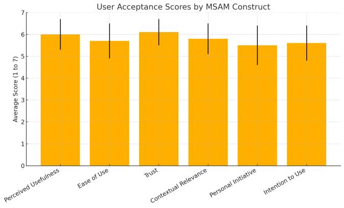 User acceptance scores across MSAM constructs. The chartpresentstheaverageratingsandstandarddeviations foreachconstruct:PerceivedUsefulness,EaseofUse,Trust, ContextualRelevance,PersonalInitiative,andIntentionto Use.