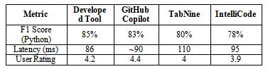 AI Tool vs Traditional Code Completion Tools: The developed tool was benchmarked against leading tools such as GitHub Copilot, TabNine, and IntelliCode. It outperformed them in several key metrics. In terms of accuracy,thedevelopedtoolachieved85%F1forPython, surpassing Copilot (83%) and TabNine (80%). It also excelledinlatency,averaging86ms,whichwaslowerthan bothIntelliCode(95ms)andTabNine(110ms).