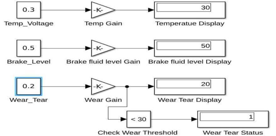 The proposed system simulates an automotive brake monitoring system using MATLAB Simulink. It processes inputsfromtemperature,brakefluidlevel,andbrakewear sensors. Voltage signals are scaled to real-world values using gain blocks. Thresholds and logic blocks evaluate