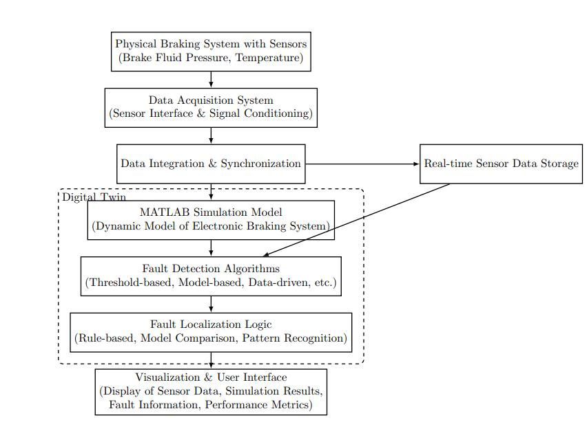 Within the digital twin, a MATLAB Simulation Model providesadynamicrepresentationoftheelectronicbraking system's expected performance. This simulated behaviour is compared against the actual system data by Fault Detection Algorithms, which can employ various methodologies including threshold-based checks, model-based deviation analysis, and data-driven techniques to identify anomalies. Upon fault detection, Fault Localization Logic, potentially utilizing rule-based systems, model comparison, or pattern recognition, works toidentifythespecificsourceornatureofthefault.Finally, the system's operational status, including raw sensor data, simulation results, detailed fault information, and key performancemetrics,ispresentedthrougha Visualization & User Interface, enabling effective human monitoring, diagnosis,anddecision-making.