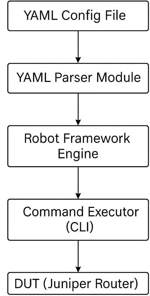 Figure 3 presents the end-to-end execution flow of the framework. It starts from YAML-based test case definition andends with validation and reporting. This modular flow allows users to update test logic by editing configuration files rather than modifying source code, significantly reducing maintenance effort and increasingadaptability.