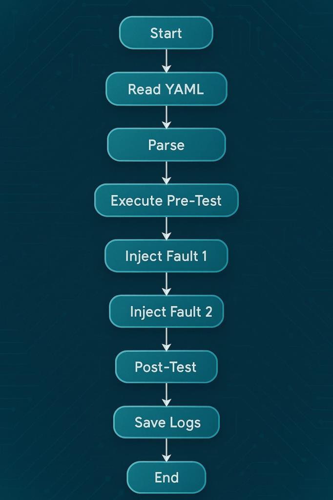 The execution flow consists of several automated stages. First,theYAMLconfigurationisparsedandtestinstructions arecompiled.Next,thefaultinjectionandmonitoringlogic isexecuted in real-time, and output is logged for each command and event. Once test execution is complete, result logs are stored in time stamped directories for later analysis. This design ensures a clear separation between test definition, execution, and result interpretation.
