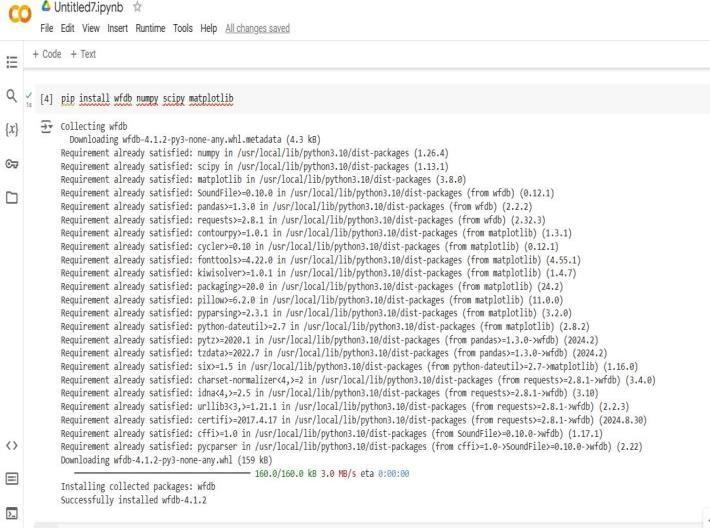 The images(Fig. 2 toFig. 6)demonstrate the step-by-step preprocessing of an ECG signal in a Google Colab environment. The process begins with the installation of key Python libraries such as `wfdb`, `numpy`, `scipy`, and `matplotlib` (Fig. 2), which are essential for working with ECG data, performing numerical operations, and creating visualizations. The raw ECG signal is then visualized (Fig. 3), showing noticeable noise and baseline drift that must