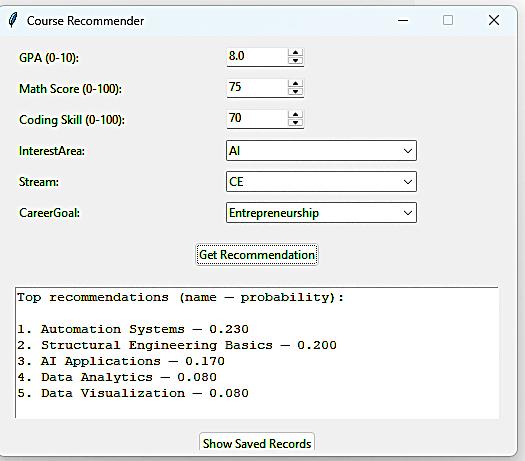 The user interface allows students to enter academic records and generate top recommendations. TheactualGUIusedintheprojectisshownbelow.