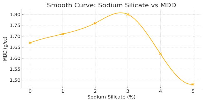 Modified Proctor Compaction Test (IS 2720 ā Part 7): Compactiontestswerecarriedouttodeterminethe MaximumDryDensity(MDD)andOptimumMoisture Content (OMC) for each mix proportion. These tests wereusedtoevaluatetheeffectofmarbledustpowder Ash and Sodium Silicate on the densification characteristicsandmoisturerequirementsofthesoil.