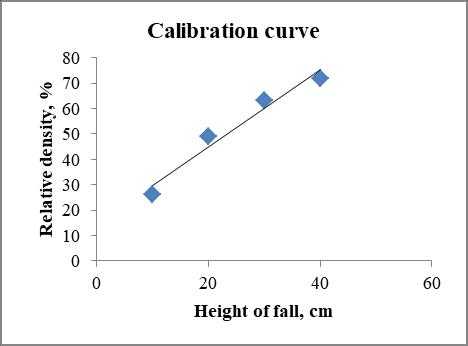 Prior to experimental work density of the sand bed is decided and the relative density of the bed is achieved by using the calibration chart of height of fall (Chart-2). A certainheightismaintainedduringpreparationofsandbed toachievethedesireddensity.Inthisstudy30%,60%and layered sand bed having both 30 and 60% is used to investigatethebehaviourofhelicalpileinvarioussandbed.