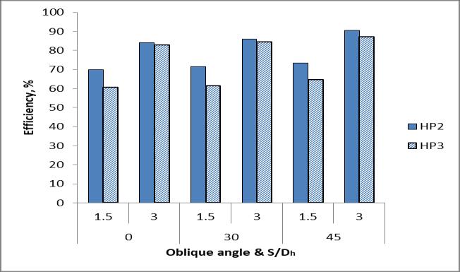 Chart -14:VariationofEfficiencyofMulti-helixpilewith obliqueangle&Inter-helixspacingratio(S/Dh-1.5&3)for HP2andHP3.