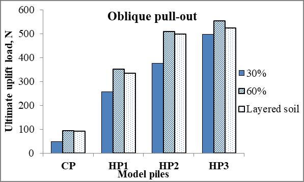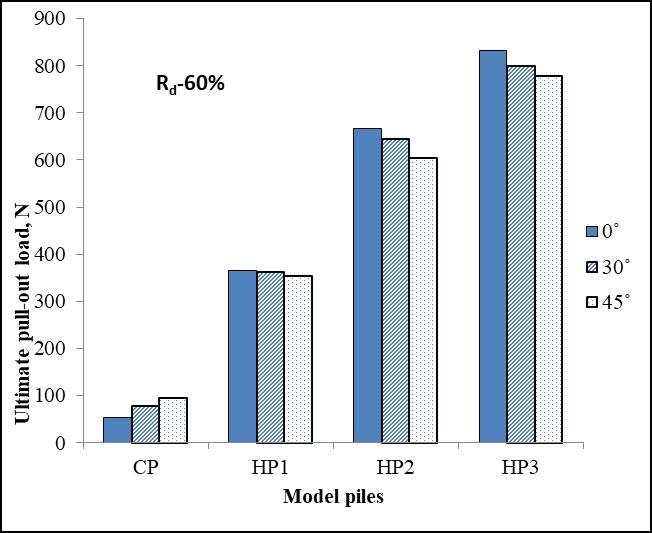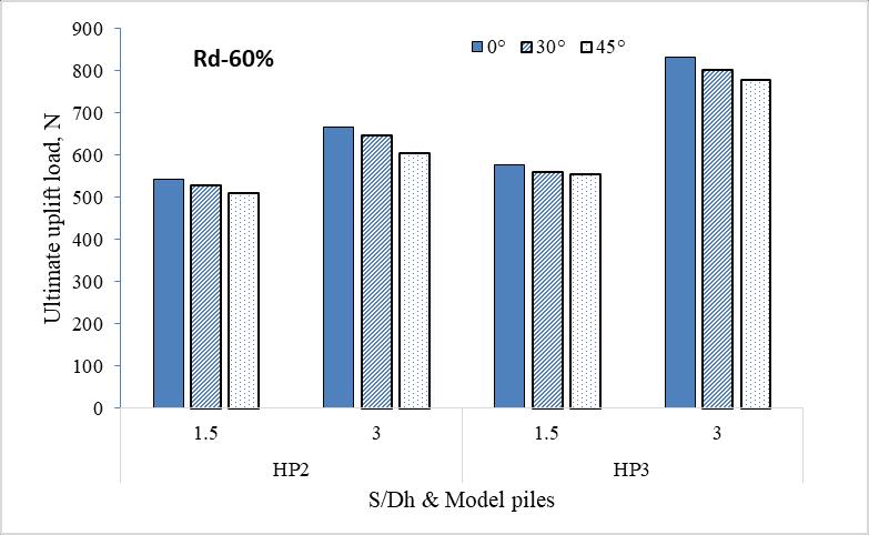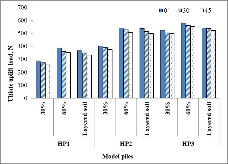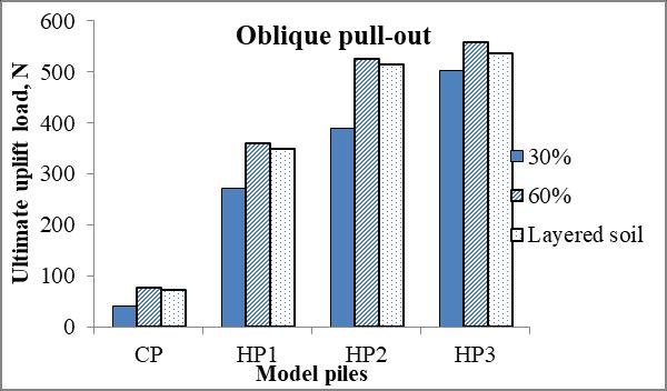 Where as in case of helical pile, as the oblique capacity tendstodecreasessignificantlyduetothedevelopmentof passivezoneswhichtendstoincreaseswithincreaseinload inclination angle and results in significant reduction in lateralcomponentofaninclinedload.FromChart-11,itwas observedthatsignificantchangeinthepulloutcapacitiesof HP2andHP3pileswhilefortheHP1pile,pulloutcapacities were nearly similar for all load inclinations. When load inclinationangleisincreasedfrom30˚to45˚,theultimatepulloutloaddecreased from 667.08N to603.5N in case of HP2and832.7Nto776.2Nincaseofhelicalpile(HP3).