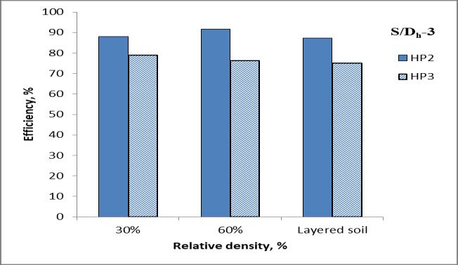 Chart -13: VariationofEfficiencyofMulti-helixpilewith RelativedensityofsoilforHP2andHP3forS/Dh-3.