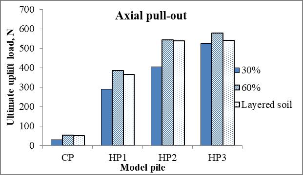 Chart-4 illustrates effect of relative density of homogenousandlayeredsandbedonaxialandobliquepullout capacities of model piles. The uplift capacity of model pileshasbeenfoundtoincreaseastherelativedensityofthe sand bed increases. This is because dense sand mobilized