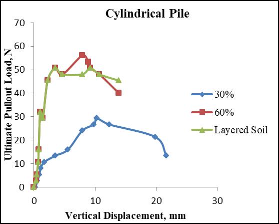When helical pile results of layered sand bed is comparedwithloose&mediumdensehomogeneousstate (30%&60%)ultimatepull-outloadcarriedbythelayered sandismorethanthehomogeneouslayerofloosestatesand bed and marginal difference with that of 60% relative densitywasobserved.Thisisduetomobilization ofmore passiveresistancebyincreasingthedensityatthebottom layerinadditiontothehelixatbottomleadstomovementof point of rotation towards the tip of the pile and this movementoffersmorepassivewedgeareawhichultimately leadstomoreupliftresistance.