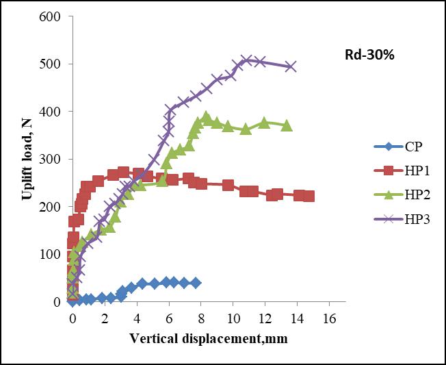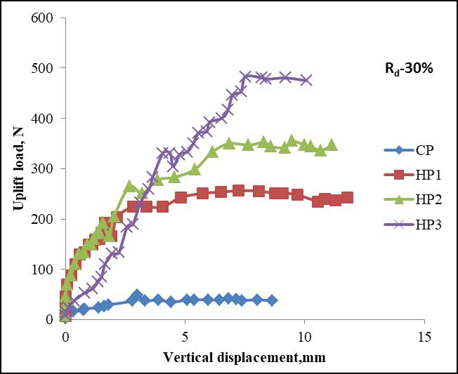 Anincreaseinrelativedensityofcohesionlesssoilfrom 30%to60%substantiallyimprovestheupliftcapacity across all pile configurations. Dense sand mobilizes greaterfrictionalresistanceandenhancesloadbearing performances.